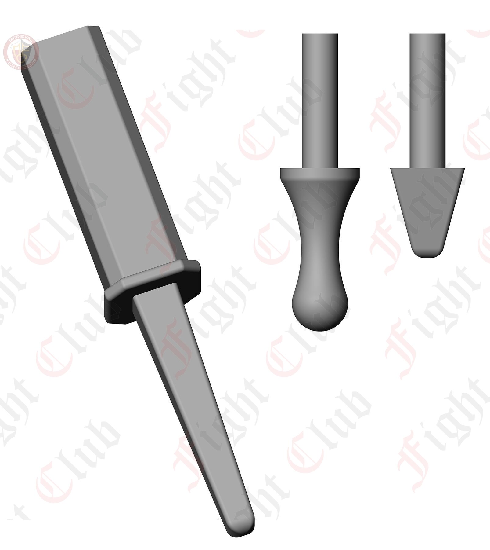 The design features a square socket with a circular port for three interchangeable end caps. The end caps are different shapes and sizes, allowing you to customise your polearm for comfort, looks, or both.